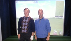 – Det er viktig at vi trives her, sier en blid og fornøyd Fredrik Enge til Golfsiden mellom slagene hvor han prøver ut simulatoren med Toralf Maurstad som tilskuer/elev. Meget hyggelig atmosfære. Han viser at både sving og slag er av høy klasse. Han har mye å lære bort – Marius Thorps og mange andres trener.