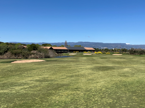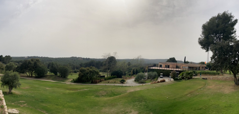 Klubbhuset er et flott tradisjonelt katalansk steinhus, her sett fra fairwayen på hull 18.