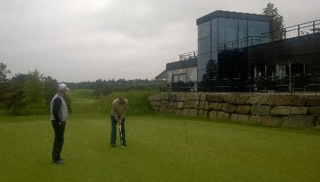 Et par seniorspillere i full trening på putting-greenen foran det flott klubbhuset.