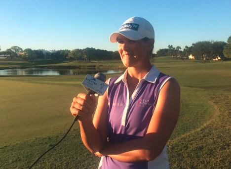 Marianne Skarpnord intervjuet etter seieren i kvalifiseringen i det andre steget i LPGA Q-school. Foto: Team Norway Golf.