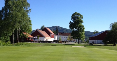 Det 18. hullet med gården og klubbhuset i bakgrunnen.