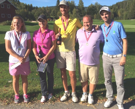 Medaljevinnerne i årets NM Mid-amatør på Aas Gaard Golfpark. Fra venstre Hege Nilbrink 2. plass, Kristin Julie Klæboe 1. plass, Magnus Jepson 1. plass, Morten Andreassen 2. plass og Knut Schiager 3. plass.
