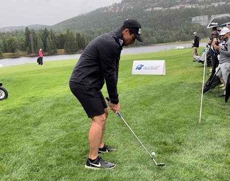hvor han pitcher fra 47 meter og treffer flagget for en enkel birdie.