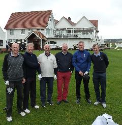 En stolt norsk gjeng på første tee på Royal Dublin. Golfsidens utsendte til høyre.