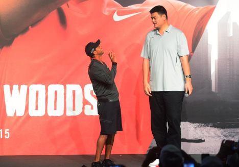 I Kina traff han basketlegenden Yao Ming. Da ble Tiger liten til sammenligning. Han la ut bildet over på Twitter.