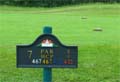 Slik er hvert hull tydelig skiltet slik at det er lett å orientere seg om sentral informasjon om hullet. Skiltet står ved inngangen til tee-stedet. Her kan noen og enhver norsk bane ha noe å lære.