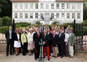 Golfsidens redaktør (t.v.) og Louis Røren stakk av med tittelen og troféet da det nordøstlige europamesterskapet for journalister ble arrangert i Lüdersburg og sto sentralt under den offisielle fotoseansen etter premieutdelingen.