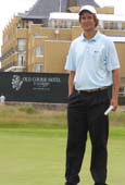 Lars Petter Brovold på 17. tee foran det berømte Old Course Hotel på treningsrunden før The Open