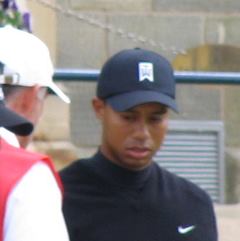 Woods under The Open på St. Andrews i 2005 med Steve Williams ved sin side i rød