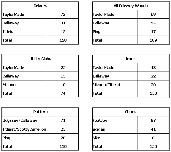 Av tabellen under fremgår det at mange spiller TaylorMade. På skosiden er FootJoy overlegen. Mange bruker Odessy puttere, men også Scotty Camron og Ping har bra tall å vise til. Kilden er Sports Marketing Service.